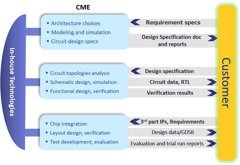Engage with customer in all stages of design from feasibility study, architecture modeling and sim, circuit and layout design, to evaluation.